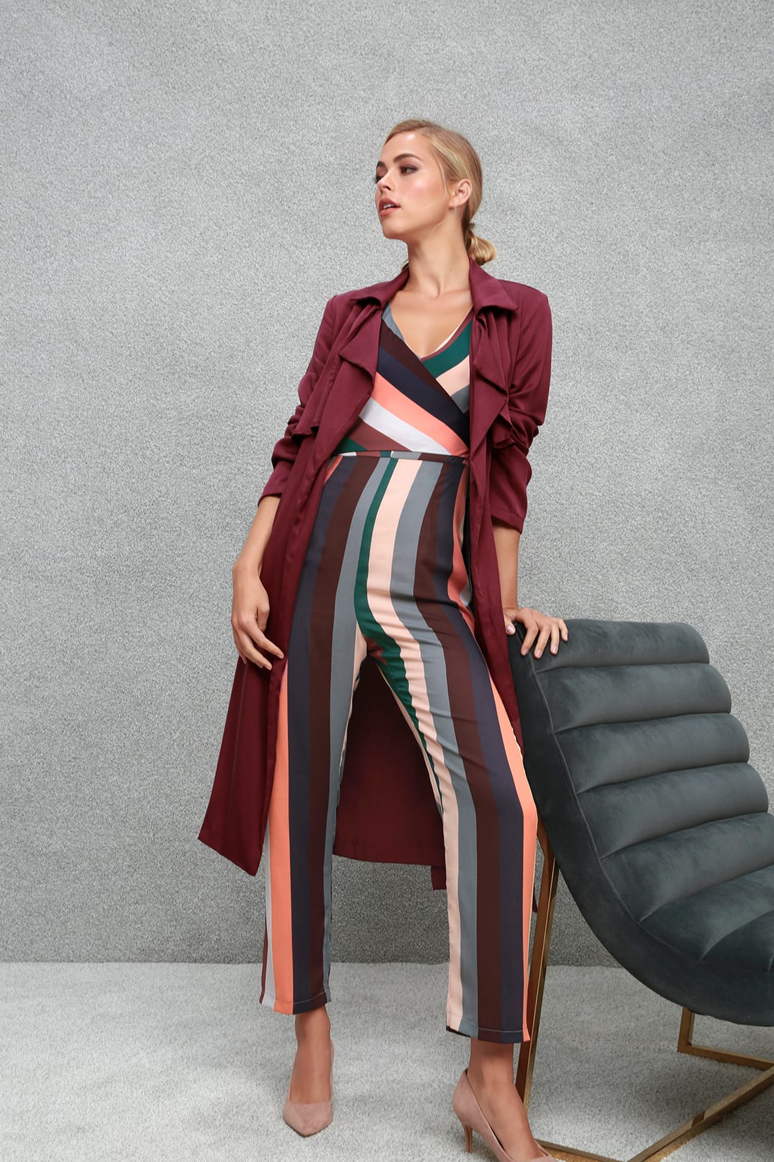 3. Lulu’s – The Ravyn Rusty Rose Multi Striped Sleeveless Surplice Jumpsuit (Right)